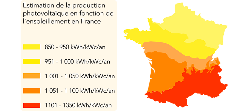 La production de vos panneaux solaires va dépendre de l’ensoleillement reçu et de la puissance dont vous disposez en toiture (ainsi que de l'orientation du panneau solaire). Pour vous donner une idée simple, nous vous avons préparé une petite carte de France.