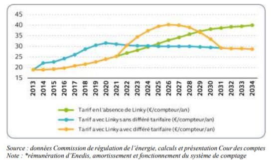 Comme le montre la prévision de la CRE mis en forme graphiquement ci-dessous dans le rapport de la Cour des Comptes, le coût par compteur et par an, diminue par rapport aux prévisions d’évolutions des couts avec l’ancien système de comptage. Le décalage temporel du report de ce coût dans le TURPE permet d’optimiser les gains et de diminuer plus rapidement l’impact pour le consommateur (environ 11 ans sans décalage contre environ 8 ans avec le décalage).