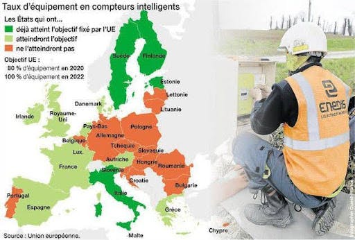 Revenons à nos moutons. 🐑 La directive européenne 2009/72/CE dont on a parlé en introduction a encouragé un déploiement des compteurs communicants à 80 % avant 2020 en Europe.