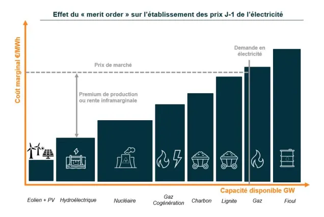 Ce mécanisme de fixation des prix conduit donc à indexer les prix de l’électricité sur la centrale appelée la moins efficiente financièrement, et dont les coûts marginaux de production sont les plus élevés.